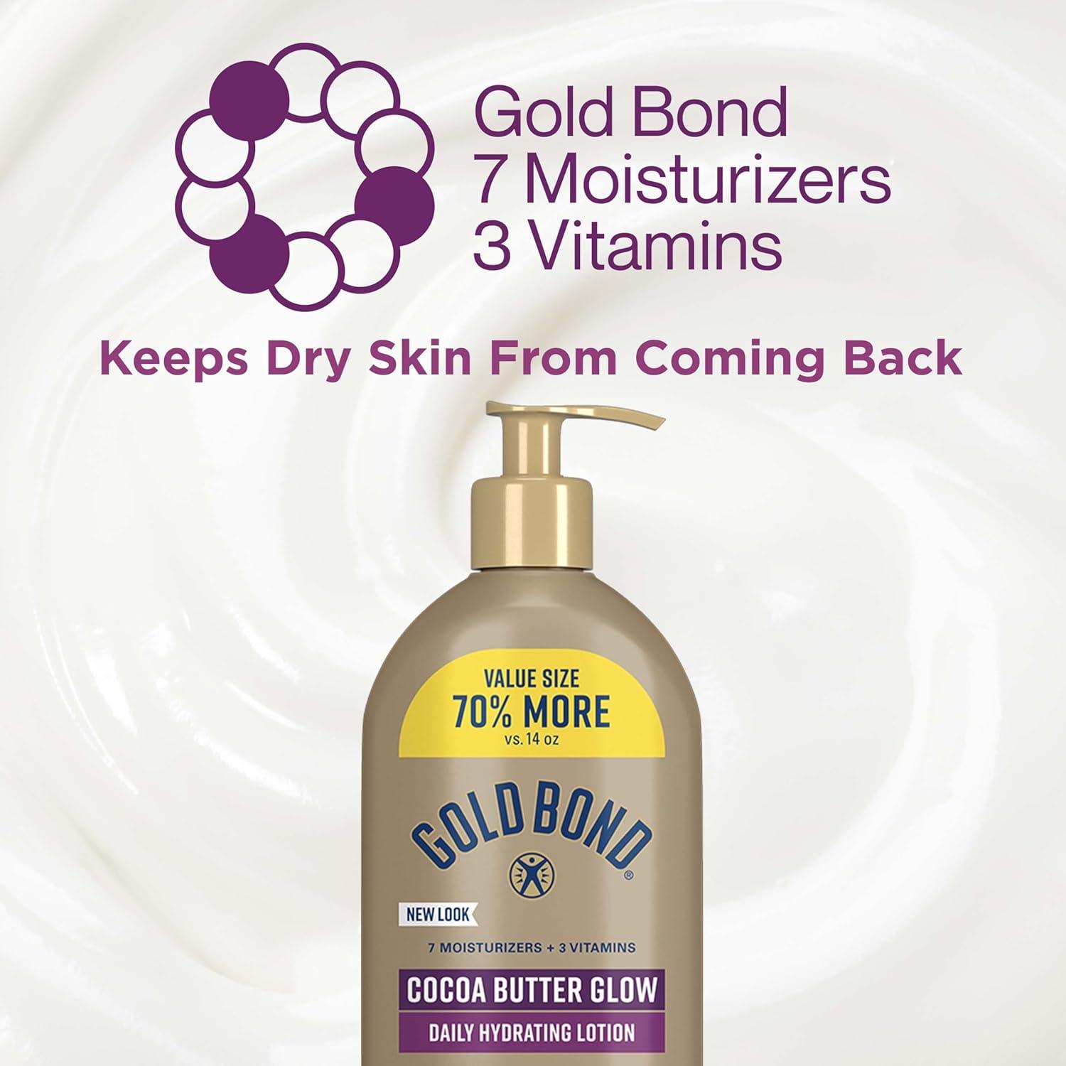 Get healthy-looking, glowing skin with Gold Bond Cocoa Butter Glow Daily Hydrating Lotion for dry skin. The triple-action formula gently exfoliates, hydrates and locks in moisture for 24 hours. You won't even know it's there while it nurtures your skin with seven nourishing moisturizers and Vitamins B, C and E. Formulated with coconut oil, cocoa butter, and shea butter, this moisturizing cream nourishes dry, ashy skin for a healthy-looking glow. Join the 88% who saw smooth and glowing skin in one day* with Gold Bond Cocoa Butter Glow Daily Hydrating Lotion. DIRECTIONS: Apply liberally to skin as often as needed. Reapply to increase level of moisturization and keep visibly dry skin from coming back. *Based on a third-party clinical study