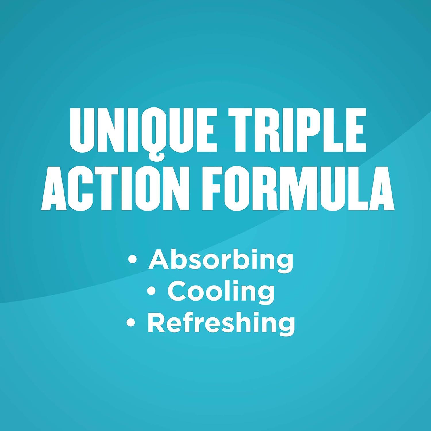 The unique triple action formula absorbs moisture, cools and controls odor Absorbs odor-causing sweat