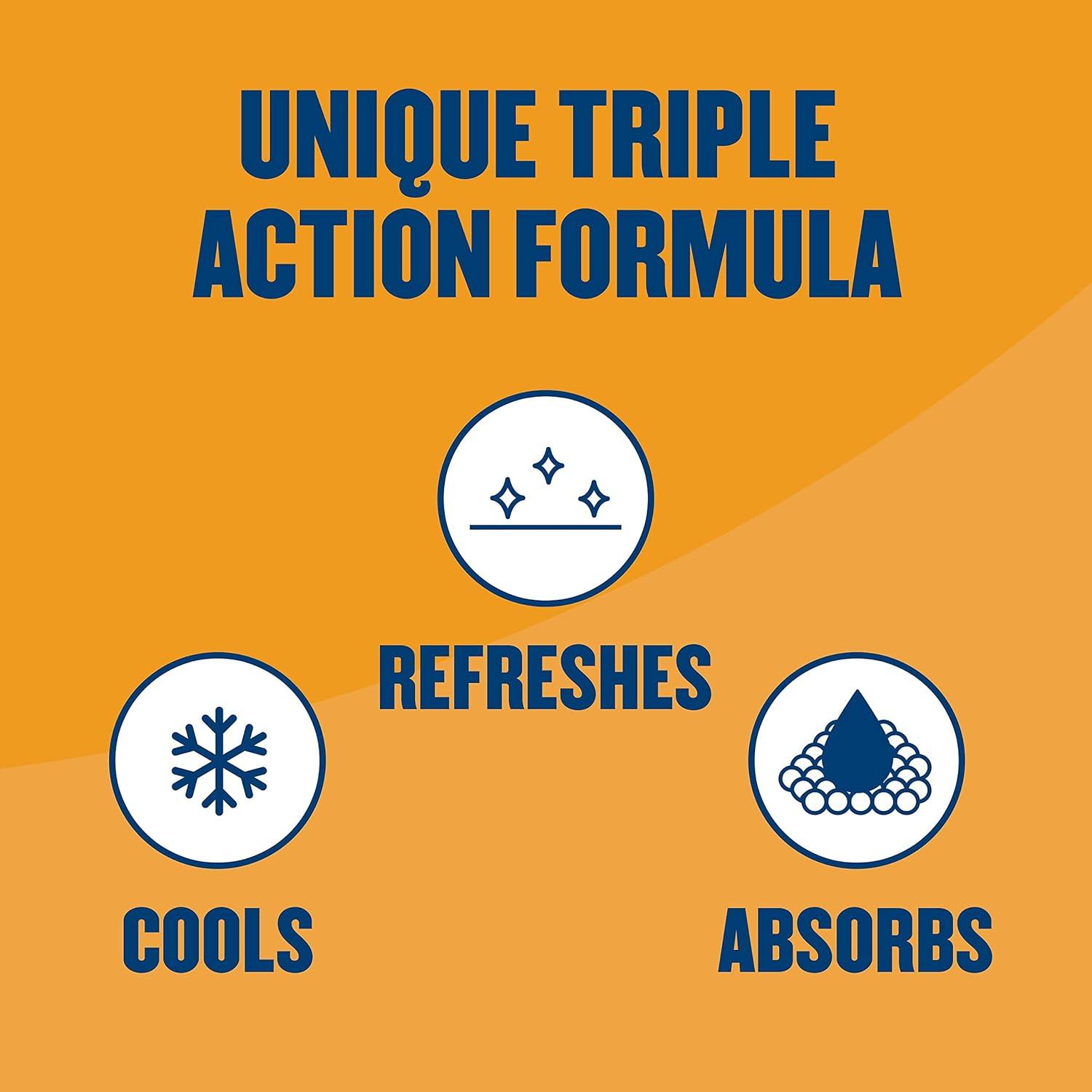 Triple-action formula cools, absorbs and refreshes for all-over odor and wetness protection Absorbs odor-causing sweat