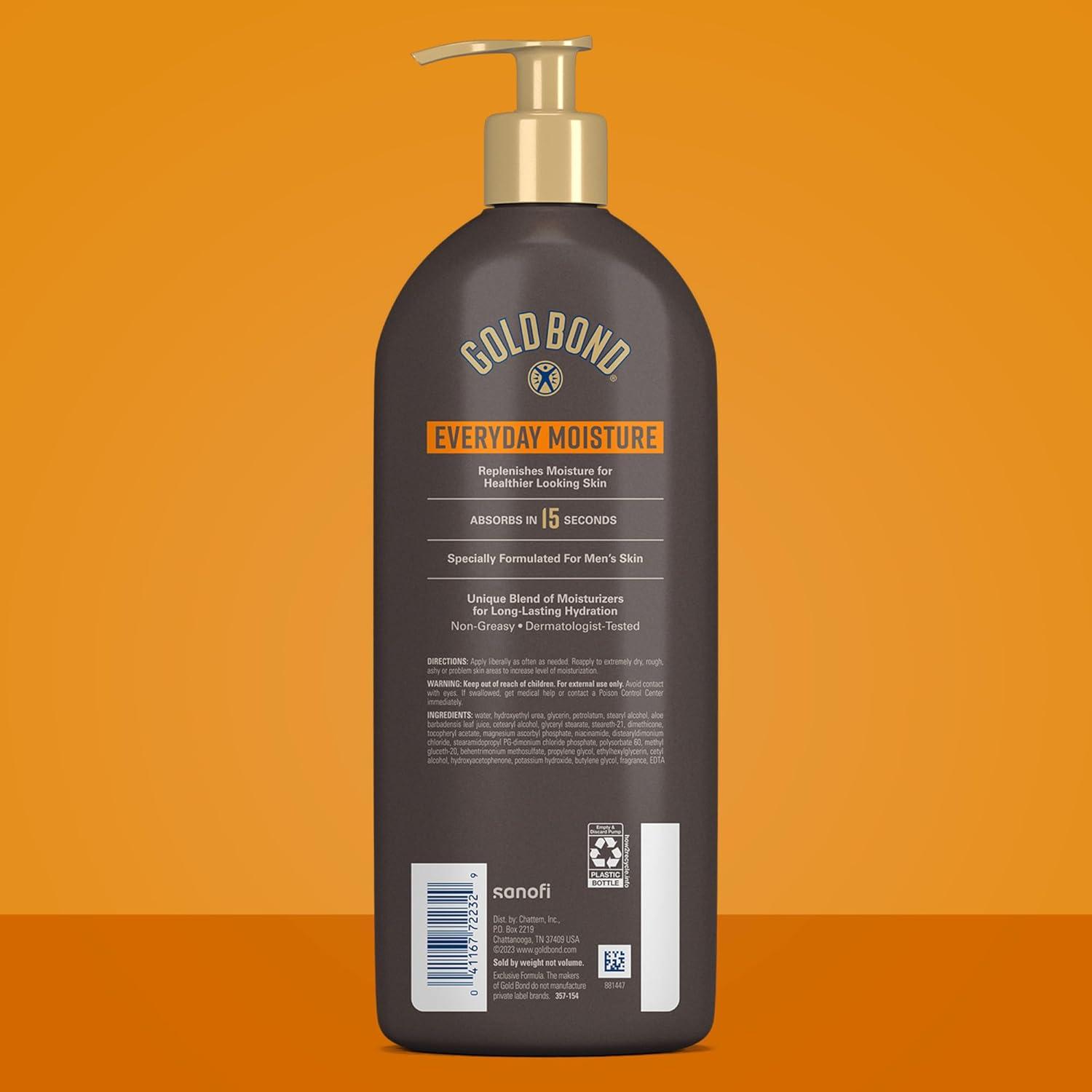 Gold Bond Men's Essentials Everyday Moisture Lotion for body and hands is formulated specifically for men with dry skin. It's made with seven moisturizers and three vitamins to replenish, hydrate and soften men's skin. This daily moisturizing formula for men also contains vitamin C, an antioxidant that helps protect skin against environmental stressors. What's more, Gold Bond Everyday Moisture Lotion for men is hypoallergenic, dermatologist-tested, fast-absorbing and nongreasy. This lotion is perfect for men who need reliable skin care. Stock up on 14.5-ounce pump bottles of this lotion so you always have nourishing hydration on hand when you need it most. This lotion is perfect for daily use. Provides long-lasting moisture relief. Ideal for all skin tones. Keep your skin feeling smooth. Ideal for daily skin care. Perfect for daily skincare routine. Designed to meet men's needs. Provides long-lasting skin hydration.